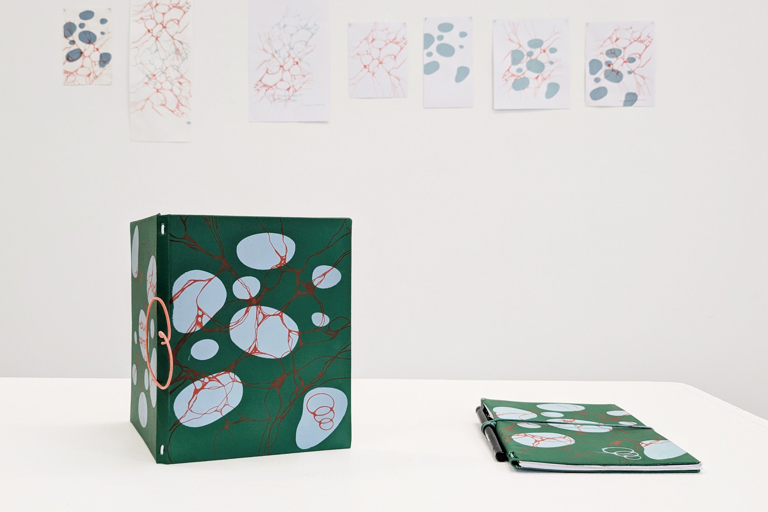 Charley Barnes, The Thought Sorter, 2025 (installation view). screen printed book cloth and coptic bound notebook, digital print on paper, elastic string. Dimensions variable.